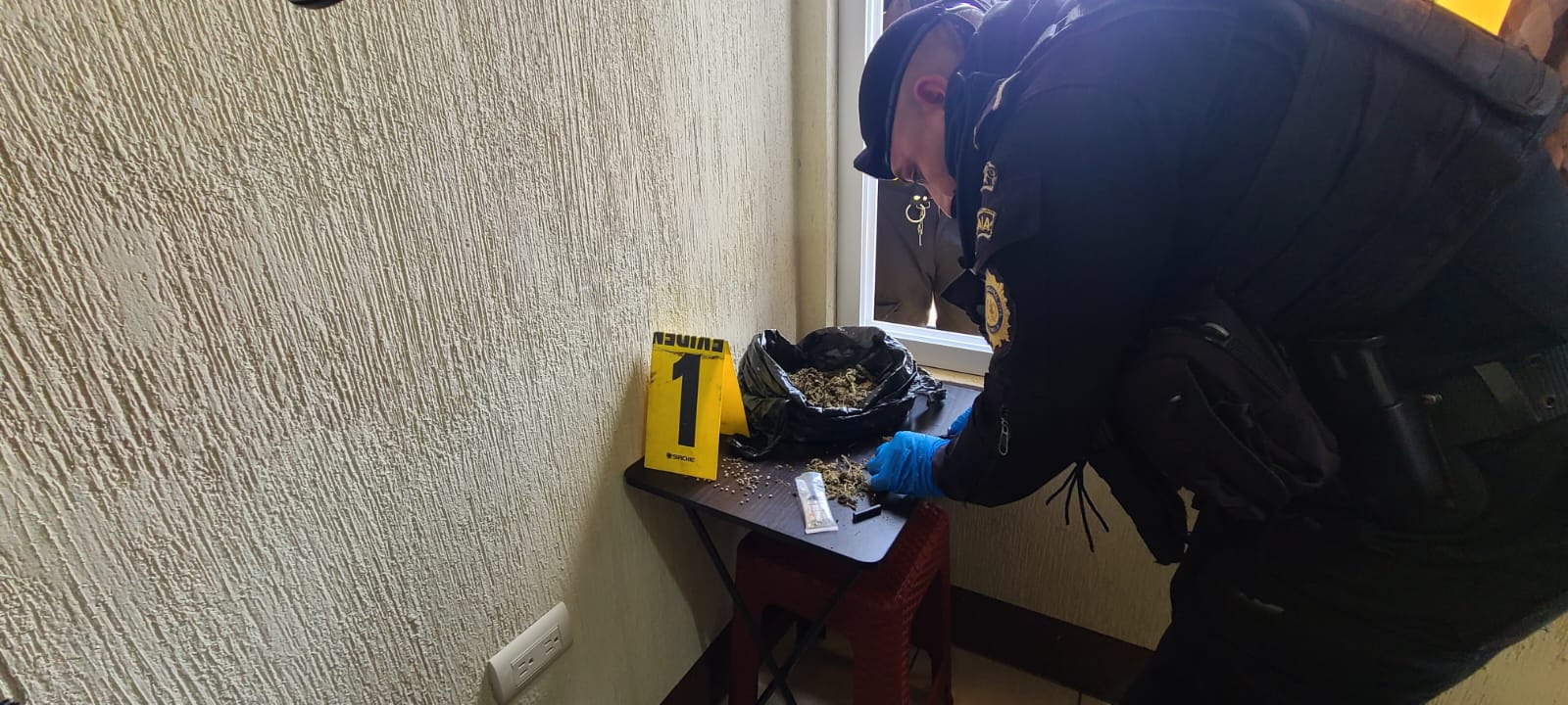 Los agentes de PNC localizaron en el segundo nivel de la residencia una bolsa de nylon de color negro, que contenía hierba seca, presuntamente de la droga denominada marihuana, con su respectiva prueba de campo.