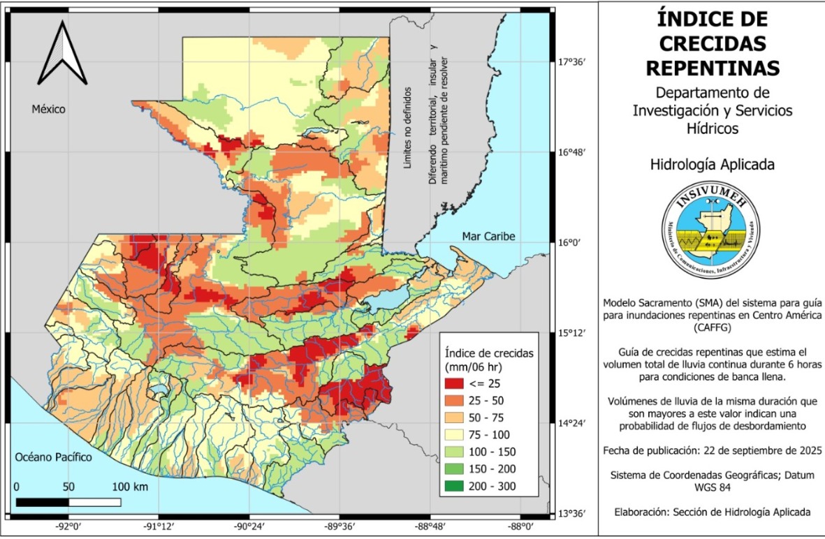 Mapa de Índice de Crecidas Repentinas Probabilidad de crecidas repentinas con relación al volumen total de lluvia continua durante 06 horas para condiciones de banca llena, correspondiente al 22 de septiembre de 2025. Enlace de consulta: https://insivumeh.gob.gt/?p=65904