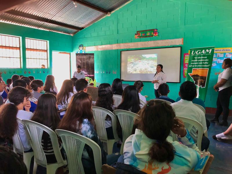 Estudiantes del Instituto Nacional de Educación Básica La Cobanerita San Benito, recibieron una capacitación sobre prácticas ambientales para aplicar en sus comunidades. Los 96 alumnos aprendieron sobre reciclaje y separación de desechos, recursos hídricos y bosques.