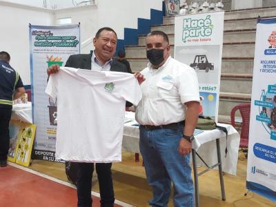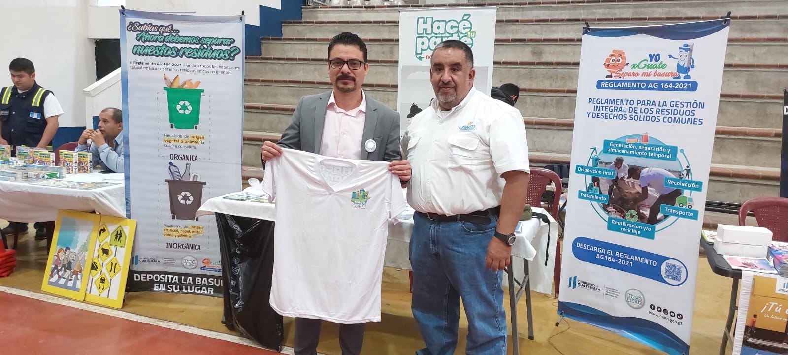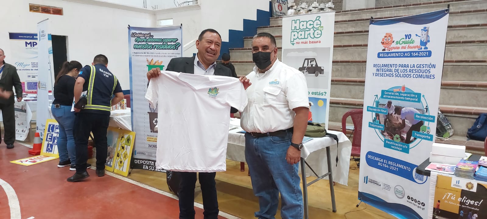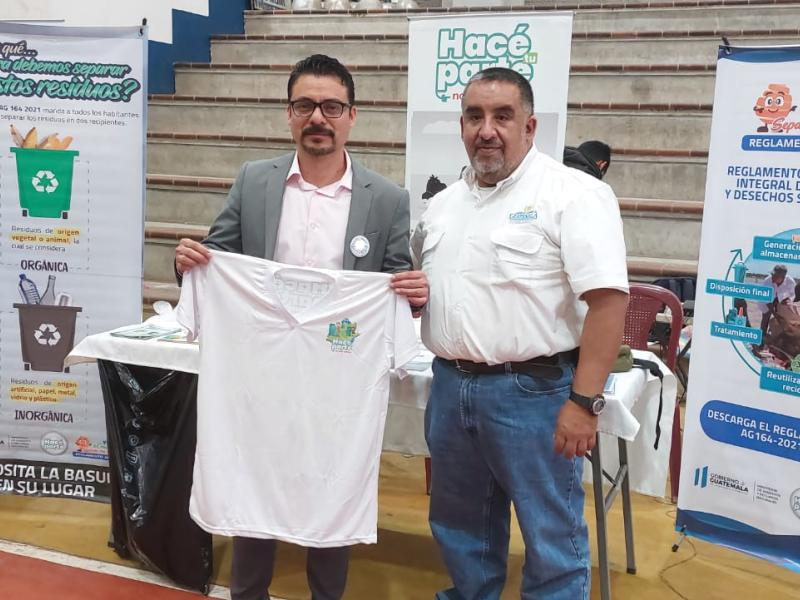 Durante la actividad, el MARN entregó un botón de la campaña Hacé tu parte, no más basura y una playera al alcalde de Patzún y al gobernador de Chimaltenango, como parte del compromiso ambiental de los funcionarios.