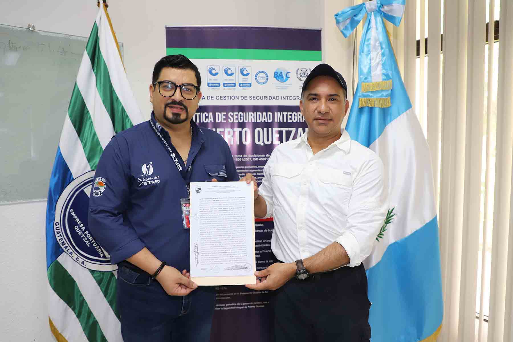 El Ministro de Ambiente y Recursos Naturales, Mario Rojas Espino, y el gerente general de la Empresa Portuaria Quetzal, David Berganza Alburéz, suscribieron hoy un Convenio Marco de Cooperación Interinstitucional, para la Implementación de una ventanilla especial que apoye y supervise el cumplimiento de los requerimientos y protección ambiental en dicha sede.