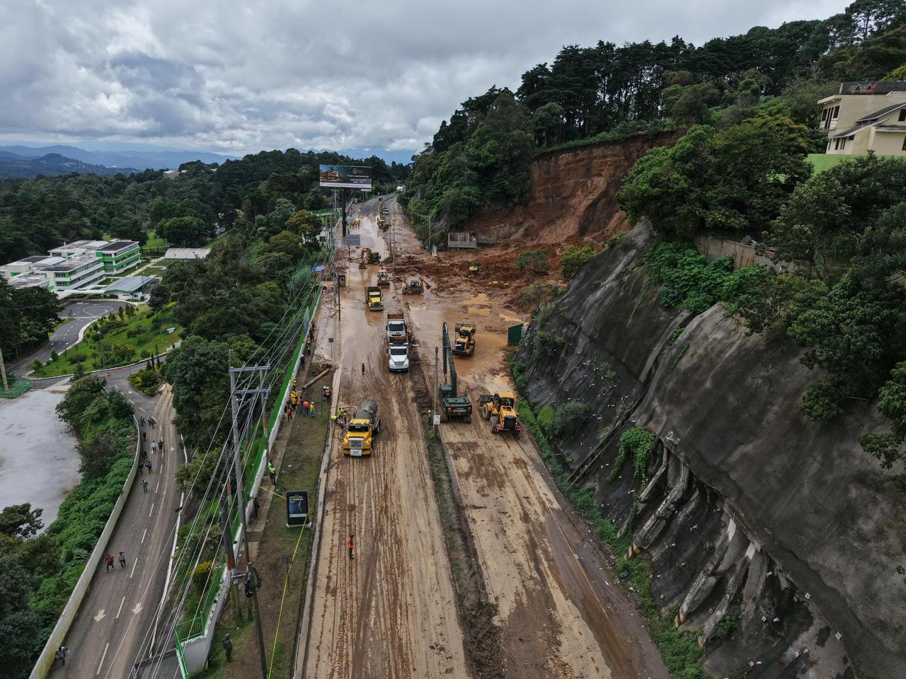 Por tercer día consecutivo, la Unidad Ejecutora de Conservación Vial (Covial) continúa con los trabajos de limpieza y retiro de material en el kilómetro 24 de la ruta CA-1 Oriente, carretera que conduce hacia El Salvador, donde un deslave mantiene el paso vehicular inhabilitado.
