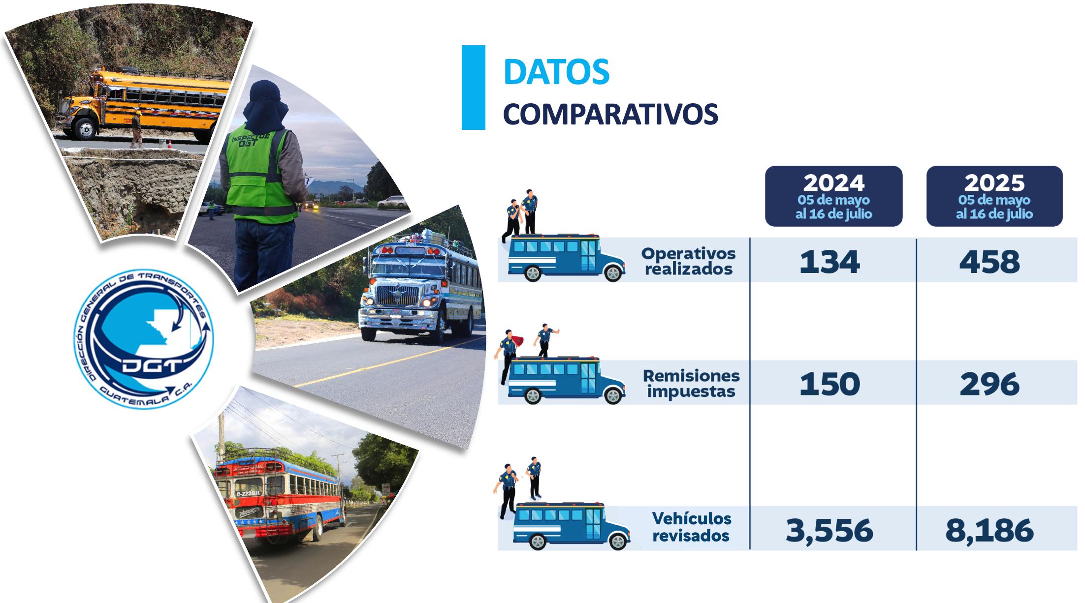 De acuerdo con datos oficiales, bajo la gestión del director Mynor González Henriquez, hasta el 15 de julio se han realizado 458 operativos, 324 más que en el mismo período de 2024. Estas acciones han derivado en 296 remisiones, lo que representa un aumento de 146 con respecto al año anterior, y la revisión de 8,186 autobuses, cifra que supera por 4,630 a la registrada en 2024.