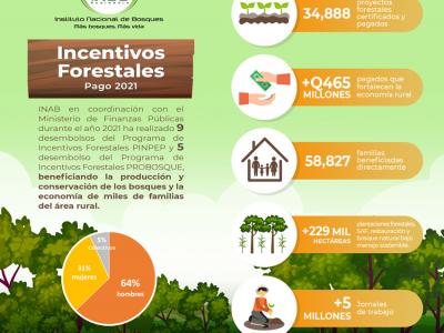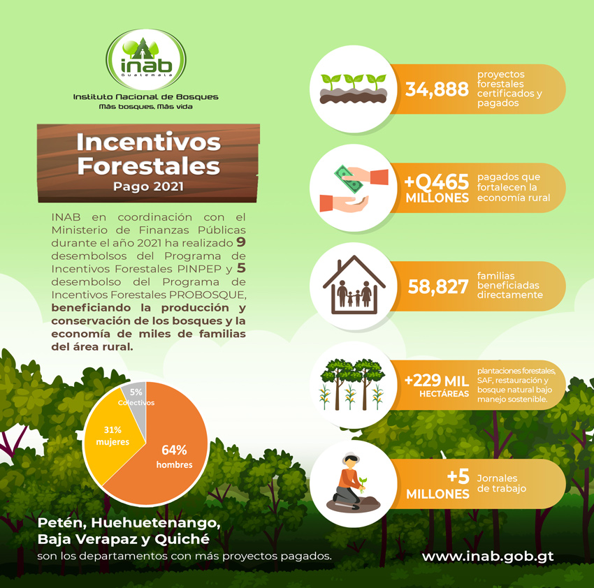 Con los incentivos forestales PROBOSQUE y PINPEP se favorece a poseedores y propietarios individuales, proyectos municipales, empresas y asociaciones. Petén, Huehuetenango, Baja Verapaz y Quiché son los departamentos con más proyectos pagados. Resaltan los que se enfocan en el establecimiento y mantenimiento de plantaciones forestales, sistemas agroforestales y el manejo de bosque natural con fines de producción y protección, así como proyectos que colaboran con la política de seguridad alimentaria y reducen el índice de deforestación a nivel nacional.