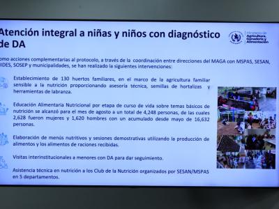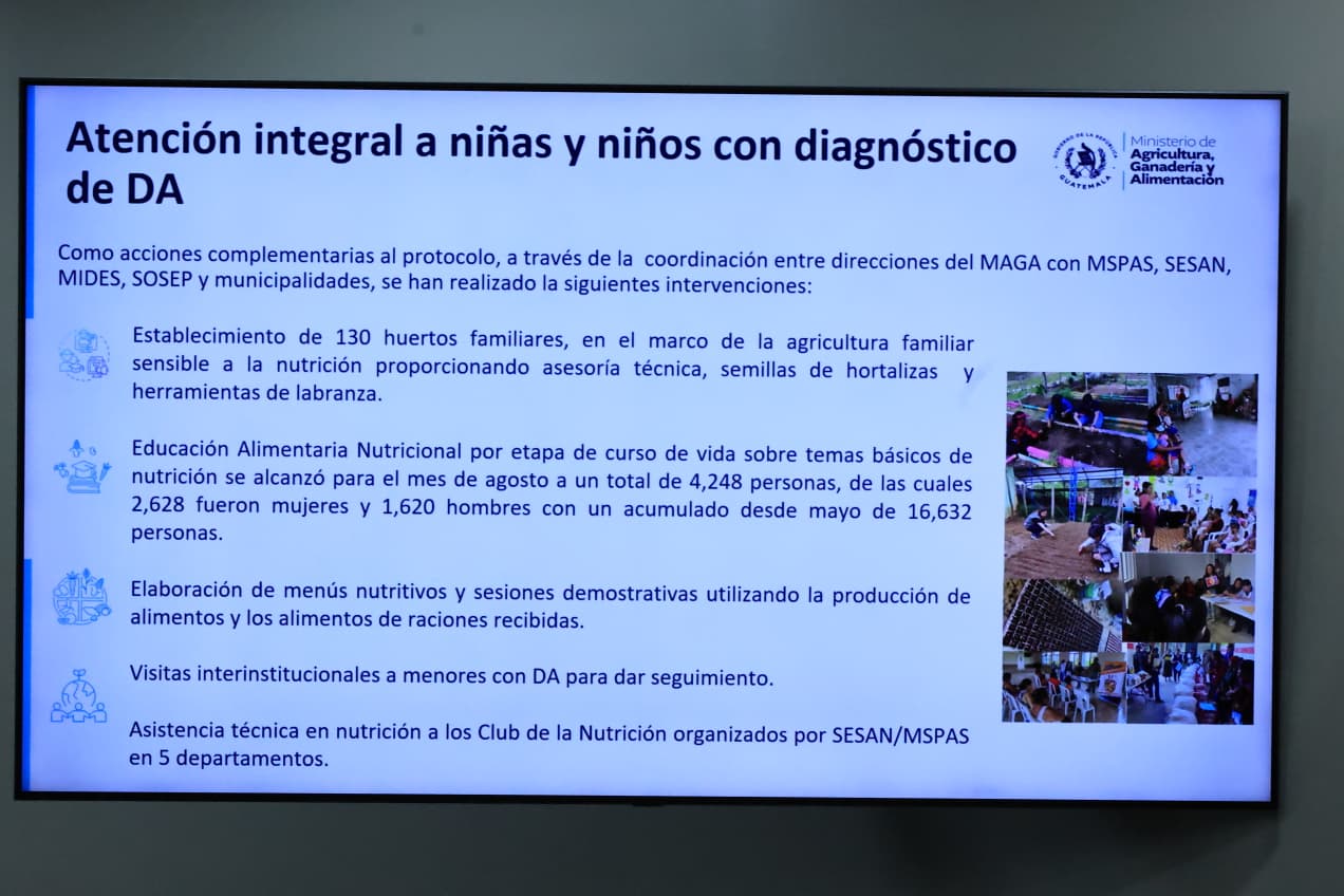 Entre enero y agosto de este año, el Gobierno de Guatemala, por medio del Ministerio de Agricultura, Ganadería y Alimentación (MAGA), brindó atención a 4939 familias afectadas por desnutrición aguda en 55 municipios priorizados, como parte de la ejecución del Protocolo Interinstitucional para el Abordaje Municipal de la Desnutrición Aguda.