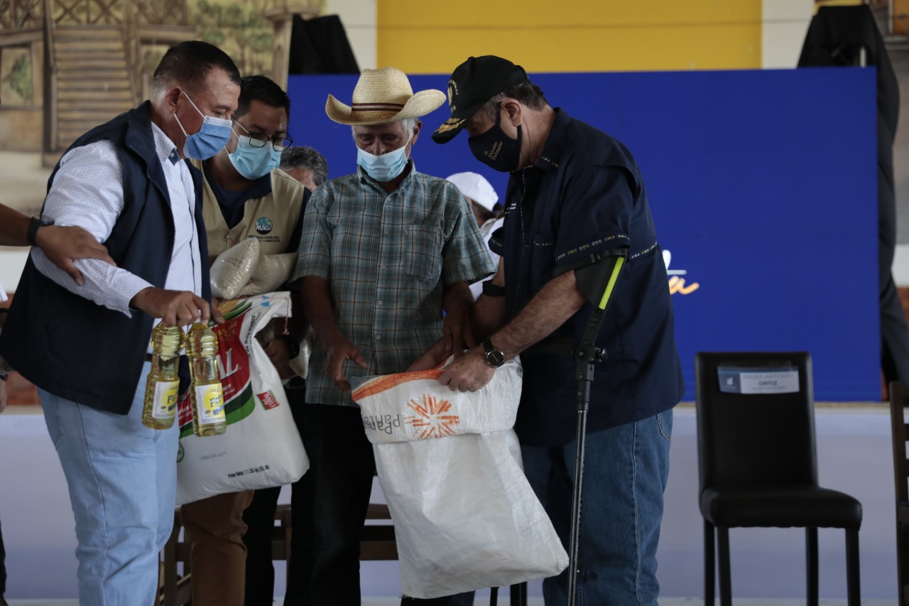 El presidente Alejandro Giammattei expresó que a cada familia recibió una bolsa con 50 libras de alimentos para garantizar el sustento del hogar. Cada beneficiario fue avalado por los Consejos Comunitarios de Desarrollo luego del trabajo realizado.