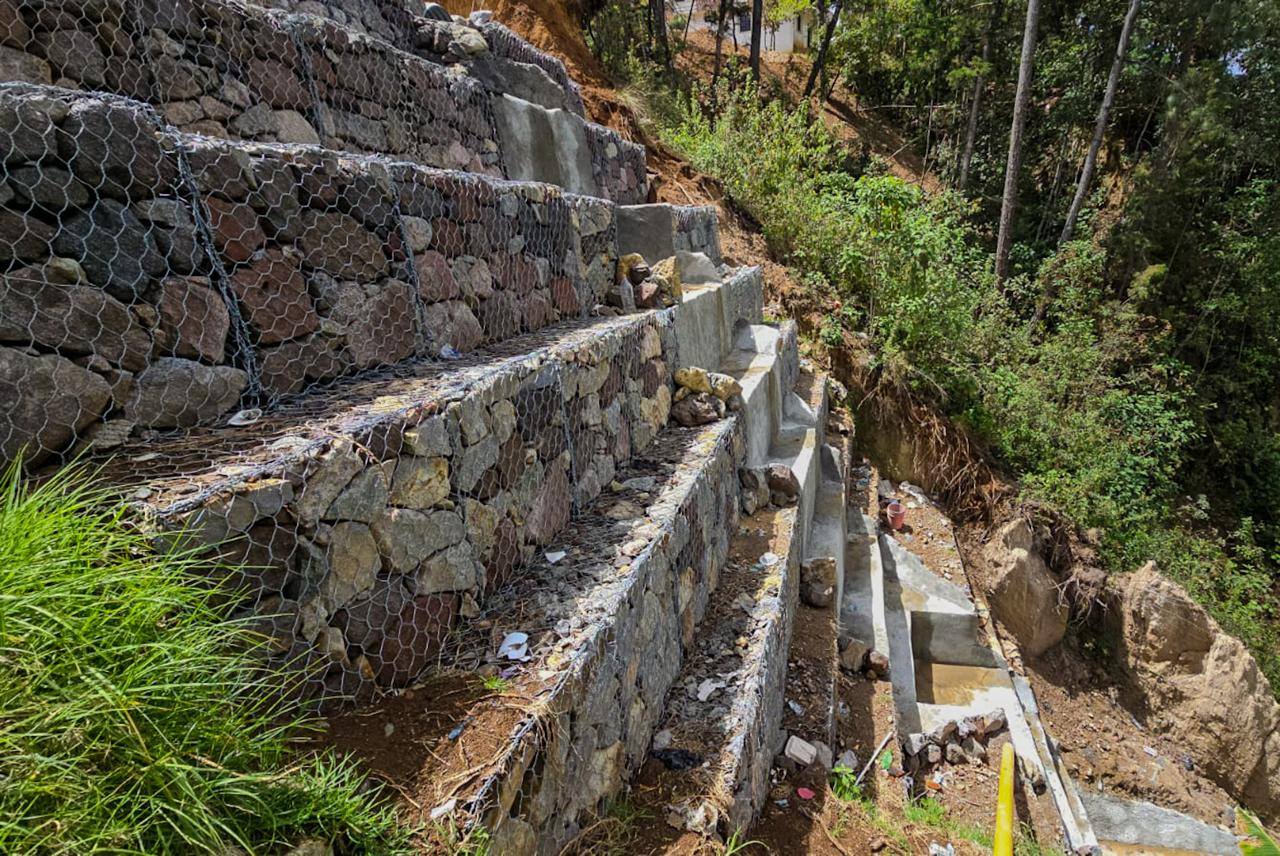 Las labores incluyen relleno compactado, excavación de cimientos y la construcción de muros de gavión, fundamentales para reforzar la estructura de la carretera y prevenir daños, especialmente en temporada de lluvias.