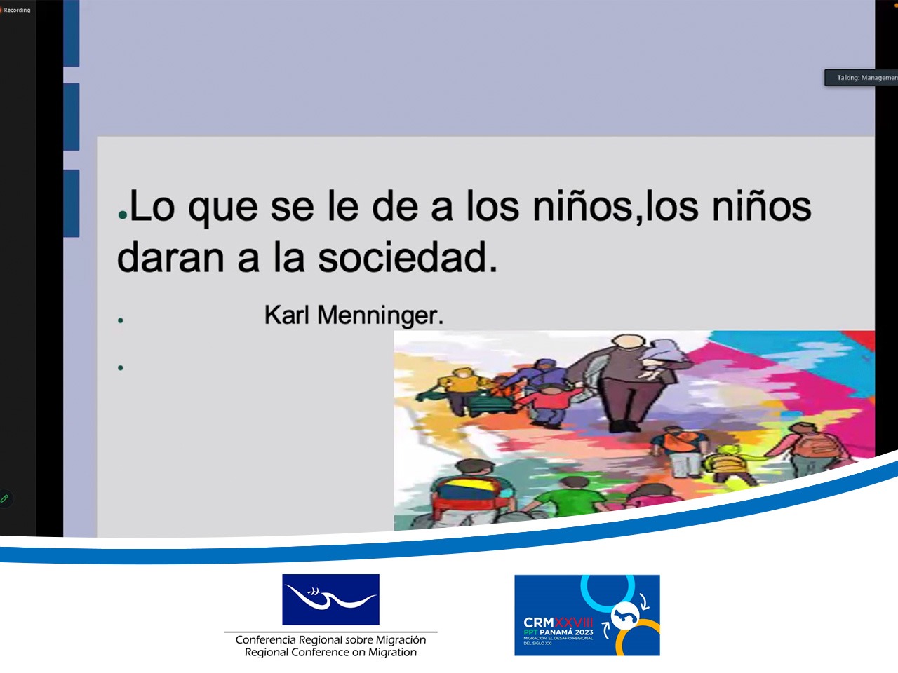 En su intervención, la Directora General de Secretaría Nacional De Niñez, Adolescencia y Familia de Panamá, Maud Ponce, detalló el trabajo que se efectúa en conjunto en la región para erradicar la brecha de desigualdad para niños, niñas y adolescentes que enfrentan durante la migración. Lo que ha permitido que Panamá se haya convertido en un referente de cuidado y atención a menores migrantes. Así mismo manifestó el interés superior frente a las necesidades de protección internacional.