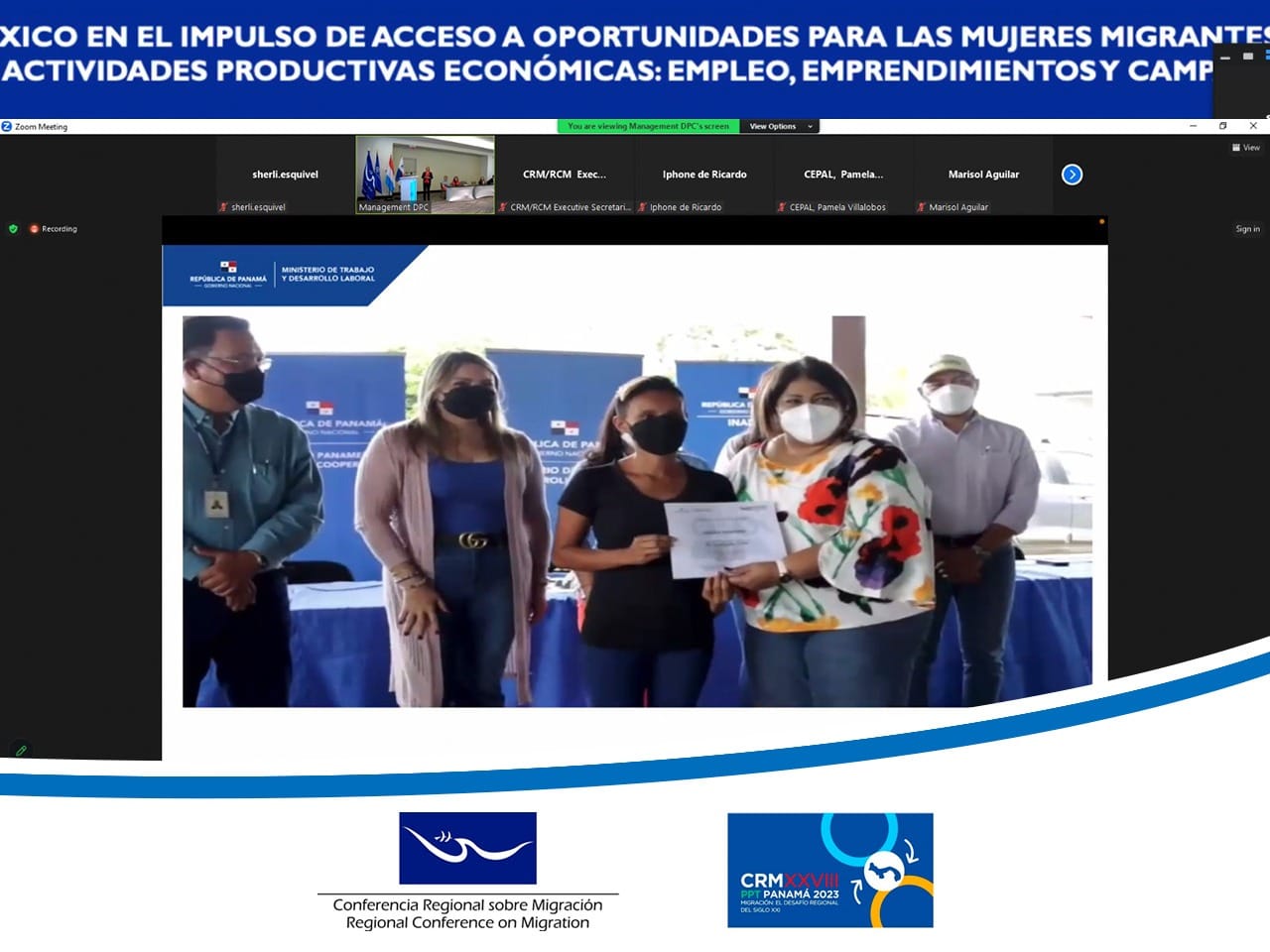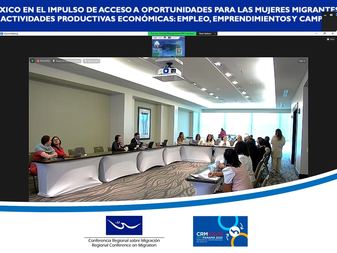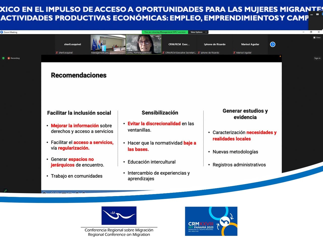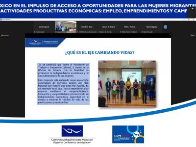 Las representantes de la Red de Mujeres Empresarias y Emprendedoras en Centroamérica y República Dominicana brindaron detalles de los proyectos que se han implementado para que las personas migrantes, especialmente las mujeres, tengan oportunidades de generar recursos económicos y que aporten a sus familias. La Red trabaja especialmente para que se respeten los derechos humanos de las mujeres migrantes a través de la generación de empoderamiento y liderazgo.