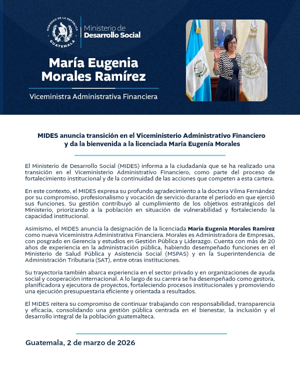 MIDES anuncia transición en el Viceministerio Administrativo Financiero y da la bienvenida a la licenciada María Eugenia Morales