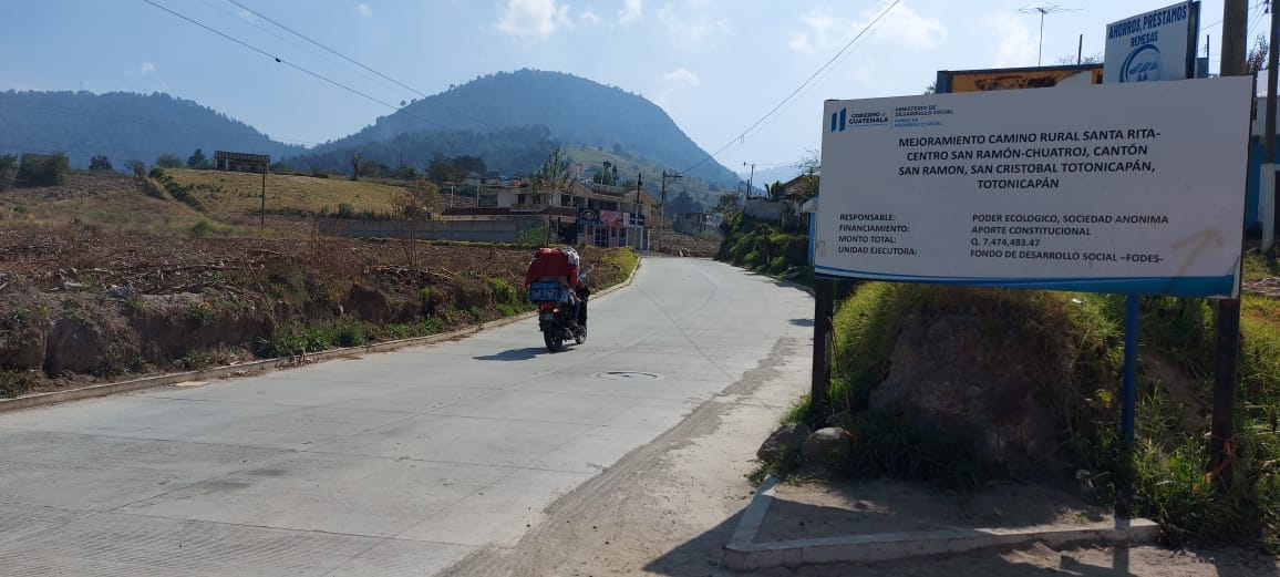 Con el fin de apoyar a la población del área rural en situación de vulnerabilidad, el Ministerio de Desarrollo Social -Mides- a través del Fondo de Desarrollo Social -Fodes-, entregó de forma oficial el 15 de diciembre el proyecto de Mejoramiento de Camino Rural Santa Rita – Centro, San Ramón – Chuatroj y cantón San Ramón, en San Cristóbal Totonicapán.