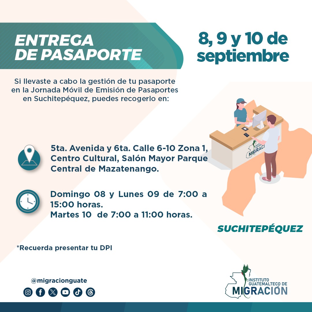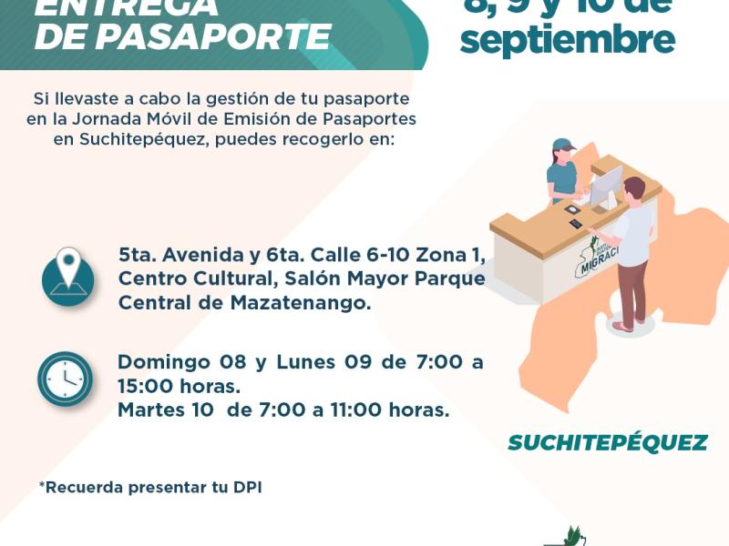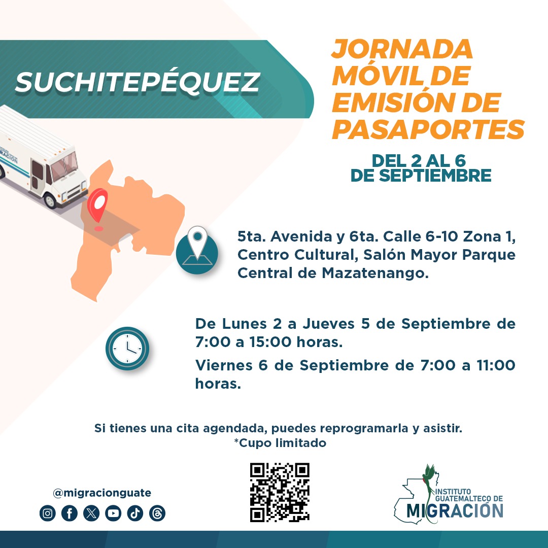 En el departamento de Suchitepéquez se realizará la Jornada Móvil de Emisión de Pasaportes del Instituto Guatemalteco de Migración del 02 al 06 de septiembre. Quienes estén interesados en tramitar su documento pueden acercarse al Centro Cultural, Salón Mayor, ubicado en la 5ta. Avenida y 6ta. Calle 6-10 zona 1, frente al Parque Central de Mazatenango, Suchitepéquez.