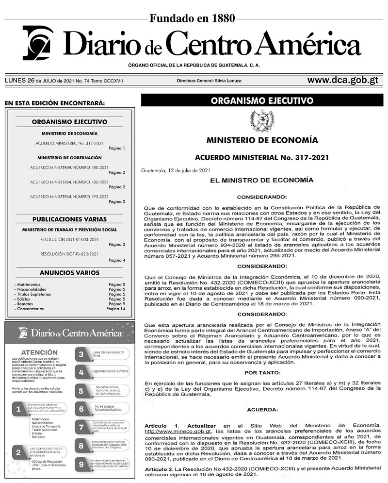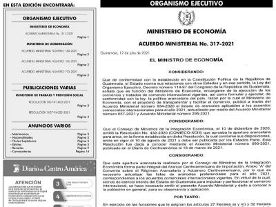 El Ministerio de Economía publicó este lunes en el Diario de Centro América, el Acuerdo Ministerial número 317-2021 por medio del cual se actualiza en el portal su sitio web las listas de los aranceles preferenciales para 12 acuerdos comerciales internacionales, de acuerdo con la resolución No.432-2020 del Consejo de Ministros de Integración Económica (COMIECO).
