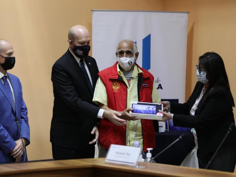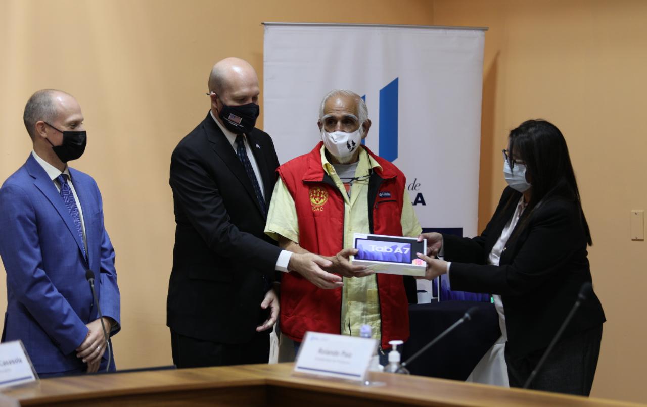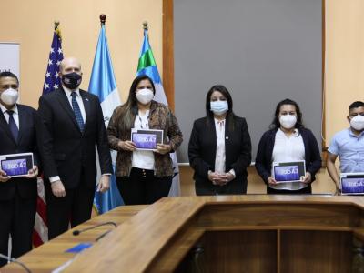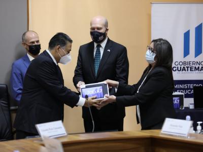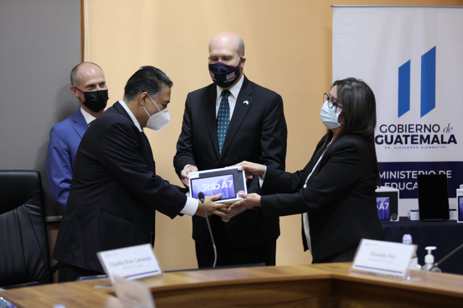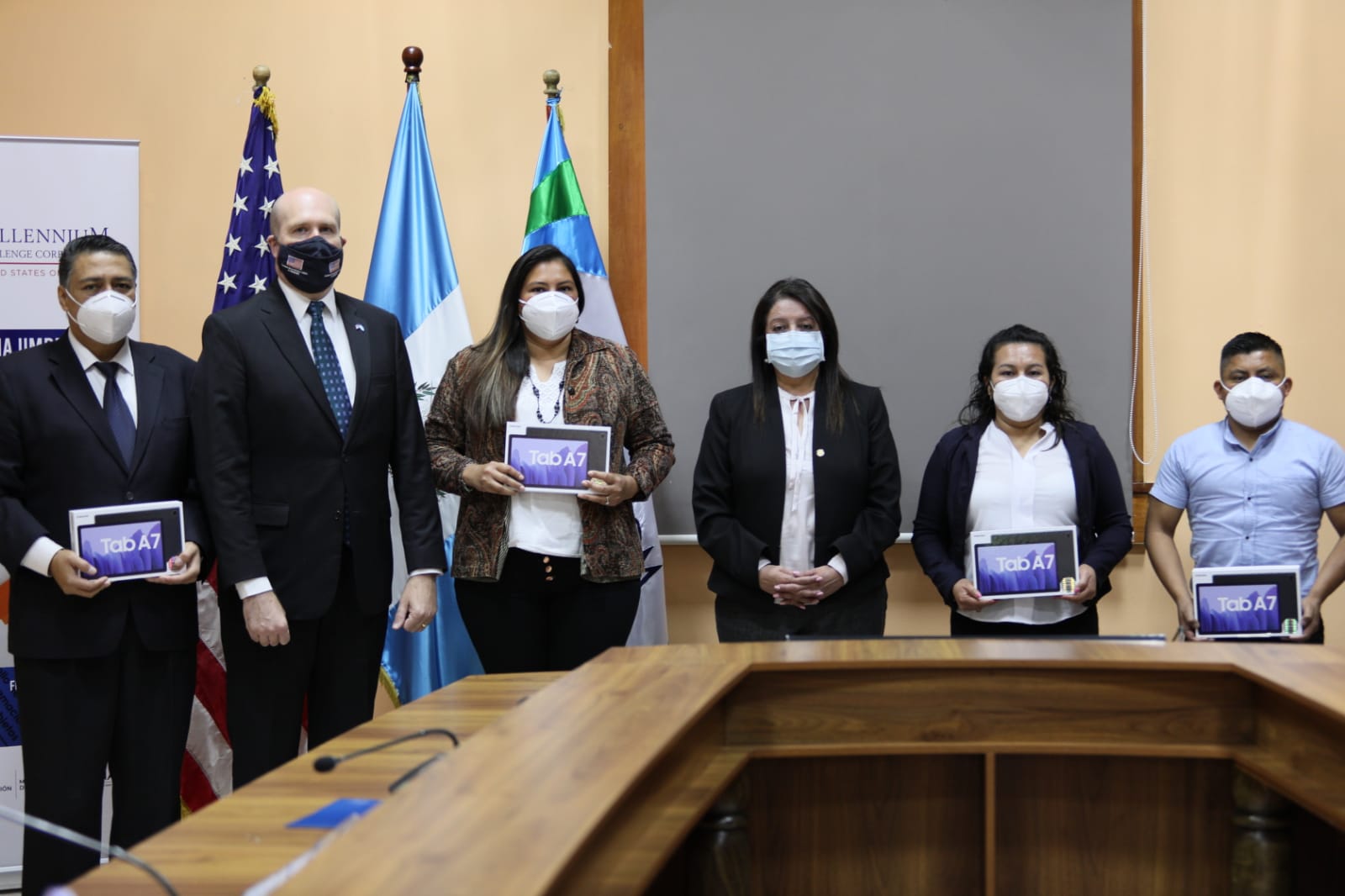 La Ministra de Educación Claudia Ruíz; Williiam Popp, Embajador Extraordinario y Plenipotenciario de los Estados Unidos de América y John Wingle, encargado de País, de Millenium Challenge Corporación (MCC), hicieron la entrega simbólica de las tablets, a docentes representantes de la Segunda Cohorte de Profesorado de Enseñanza Media con especialidad en Matemática, de los departamentos de Huehuetenango, Quetzaltenango, San Marcos, Totonicapán, Quiché, Guatemala y Baja Verapaz.