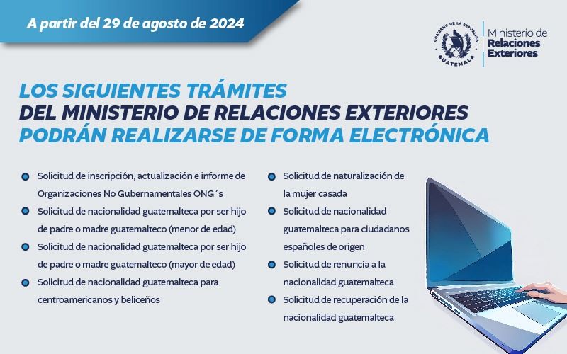 El Ministerio de Relaciones Exteriores publicó en el diario oficial el Acuerdo Gubernativo 135-2024 el cual contiene el listado de requisitos para presentar solicitudes y la documentación respectiva, según los distintos servicios que ofrece en línea. Los más recientes son: Solicitud de Nacionalidades en sus diferentes opciones; y la inscripción, actualización e informes de donaciones de organizaciones no gubernamentales.