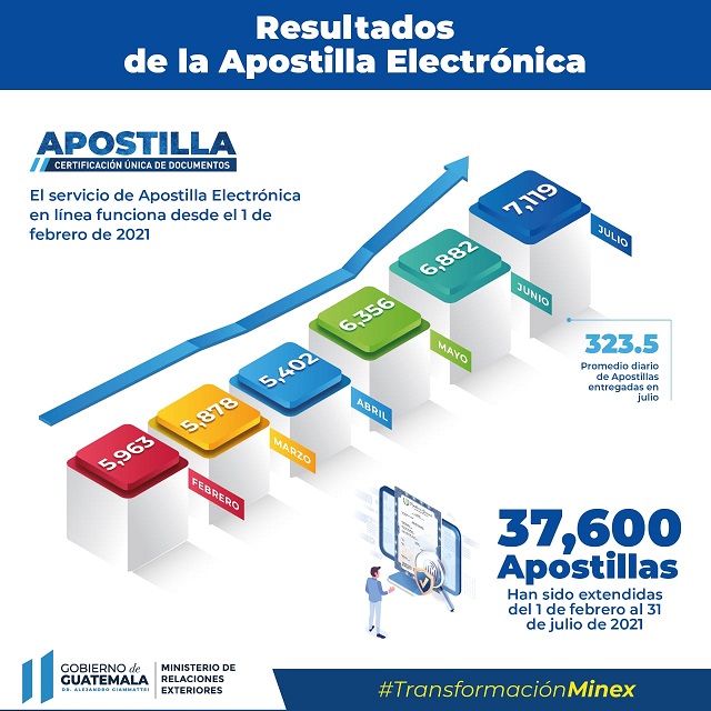 De acuerdo con la Unidad de Modernización del Minex, en febrero, primer mes de la implementación de la Apostilla Electrónica en línea, se emitieron 5,963 certificaciones; 5,863 en marzo; 5,402 en abril; 6,356 en mayo; 6,882 en junio y subió a 7,119 en julio, para marcar un promedio diario de 323.5 en el último mes.