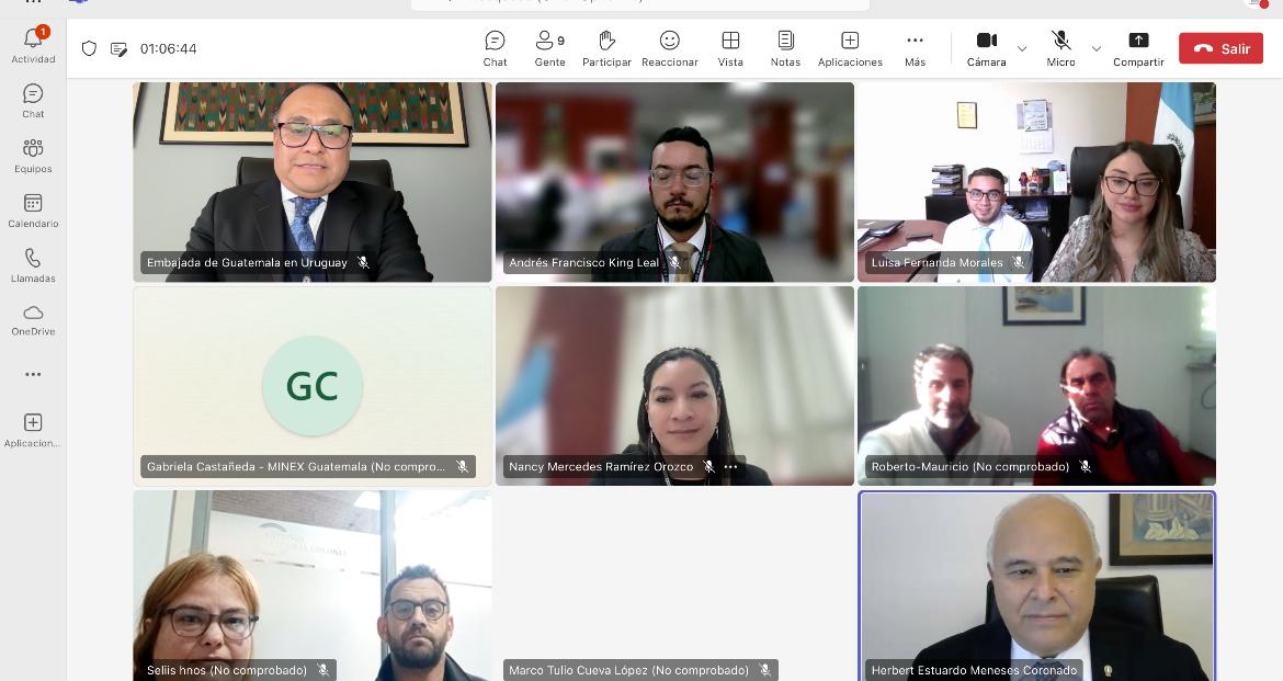 Montevideo, Uruguay, 20 de mayo de 2025. Funcionarios de la Embajada de Guatemala en Uruguay y de las Direcciones de Cooperación y de Política Económica del Ministerio de Relaciones Exteriores (MINEX) organizaron una videoconferencia con empresarios y técnicos del sector lechero del departamento uruguayo de Colonia y con el Dr. Marco Tulio Cueva López, experto guatemalteco en el desarrollo integral con el modelo de economías de escala.