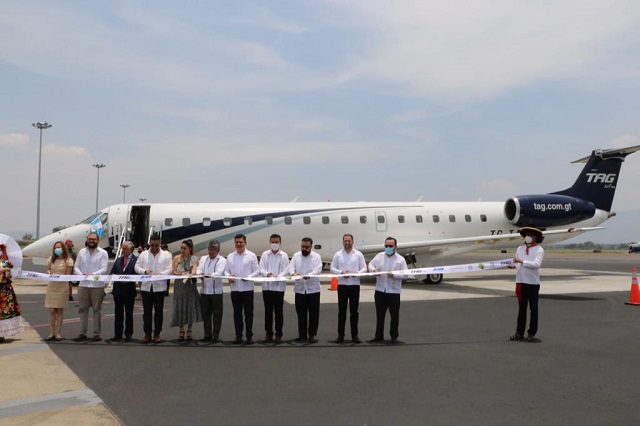 Guatemala, 6 de mayo de 2022. Funcionarios del Ministerio de Relaciones Exteriores (Minex) participaron en la inauguración de una nueva ruta aérea de TAG Airlines que conecta a la ciudad de Guatemala con Oaxaca, México.