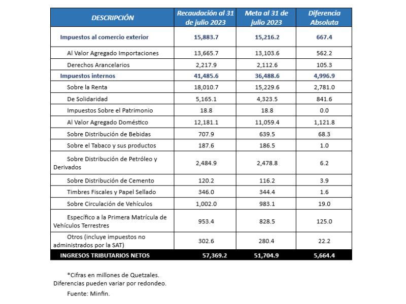 Este monto es superior en Q5,664.4 millones con respecto a los Q51,704.9 millones programados para los primeros siete meses del año. El informe también destaca que la recaudación tributaria total neta de julio alcanzó los Q11,116.4 millones, superando en Q1,188.0 millones la meta para ese mes, fijada en Q9,922.4 millones.