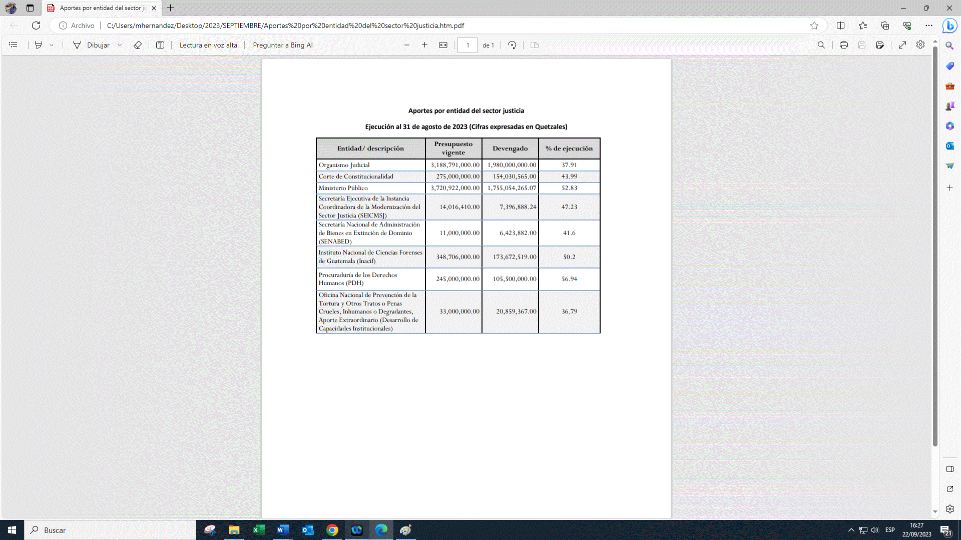 Entre las entidades que registran una mayor ejecución de su presupuesto, destacan la Procuraduría de Derechos Humanos (PDH), con un 56.94%, equivalente a Q105.5 millones; el Ministerio Publico (MP), con 52.83%, que suma Q1,755.0 millones, y el Instituto Nacional de Ciencias Forenses de Guatemala (INACIF) con 50.20%, que asciende a Q173. 7 millones.