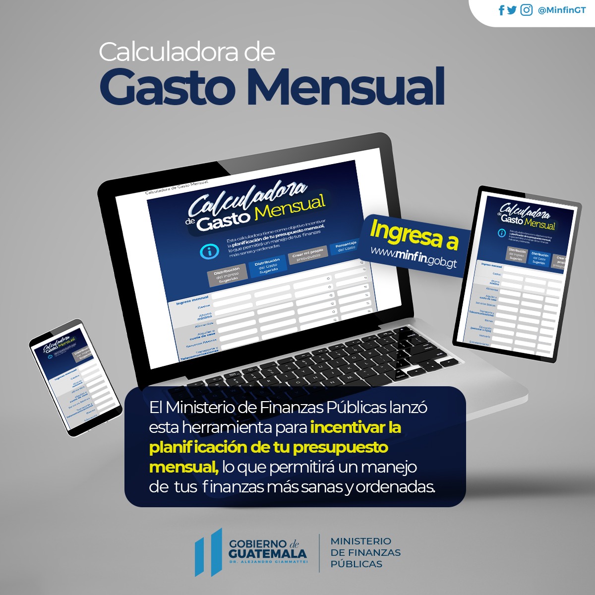 El Ministerio de Finanzas Públicas (MINFIN) ha implementado la herramienta Calculadora de Gasto Mensual, con el objetivo de incentivar la planificación del presupuesto mensual de los guatemaltecos, y con ello contar con finanzas saludables.