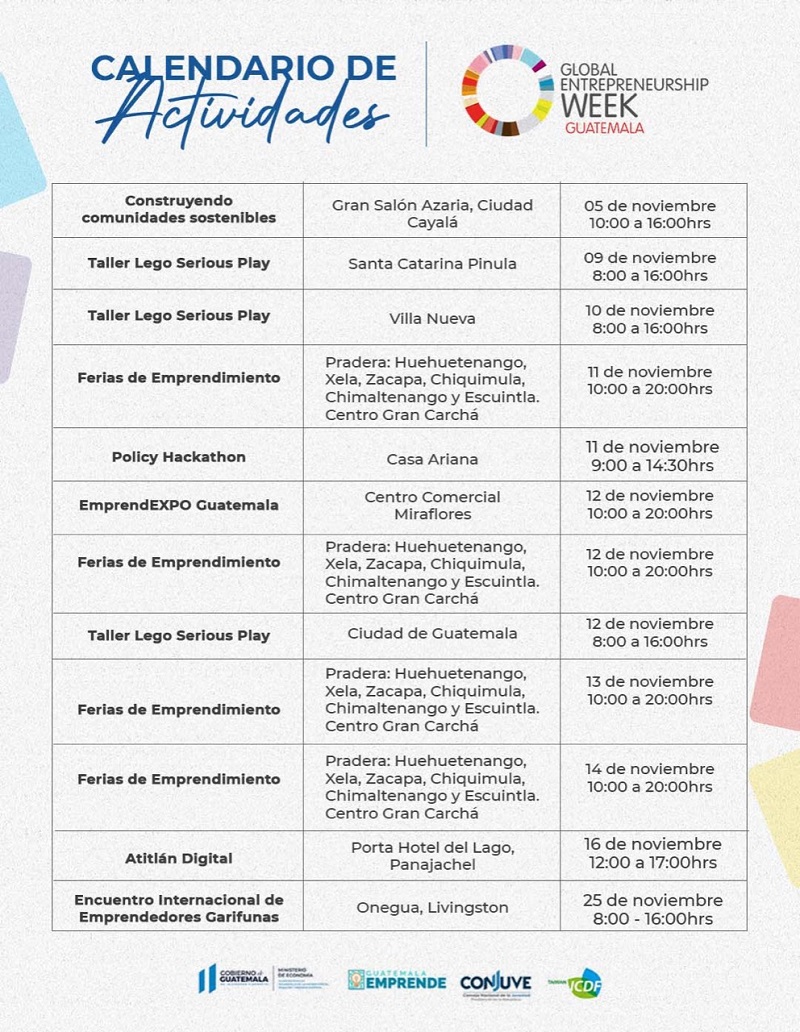 La Semana Global del Emprendimiento tiene como marco las acciones prioritarias para el 2021 que forman parte del Plan para la Reactivación Económica de Guatemala, elaborado por el Ministerio de Economía y cuyos ejes principales son la generación de empleo, la atracción de inversiones estratégicas y el fomento de consumo de productos nacionales a nivel local, regional y mundial.