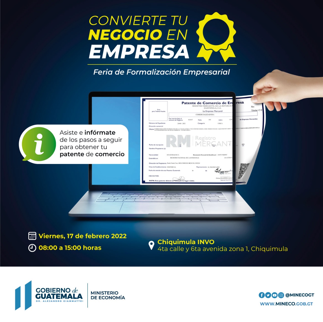 Según se explicó, la Feria de Formalización es el escenario ideal para que las personas que se encuentren operando en el comercio informal, tengan la oportunidad de formalizar su comercio inscribiéndose como comerciantes individuales ante el Registro Mercantil (RM) y obtener su patente de comercio sin tener que pagar honorarios profesionales por dicho procedimiento de inscripción.