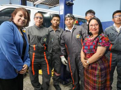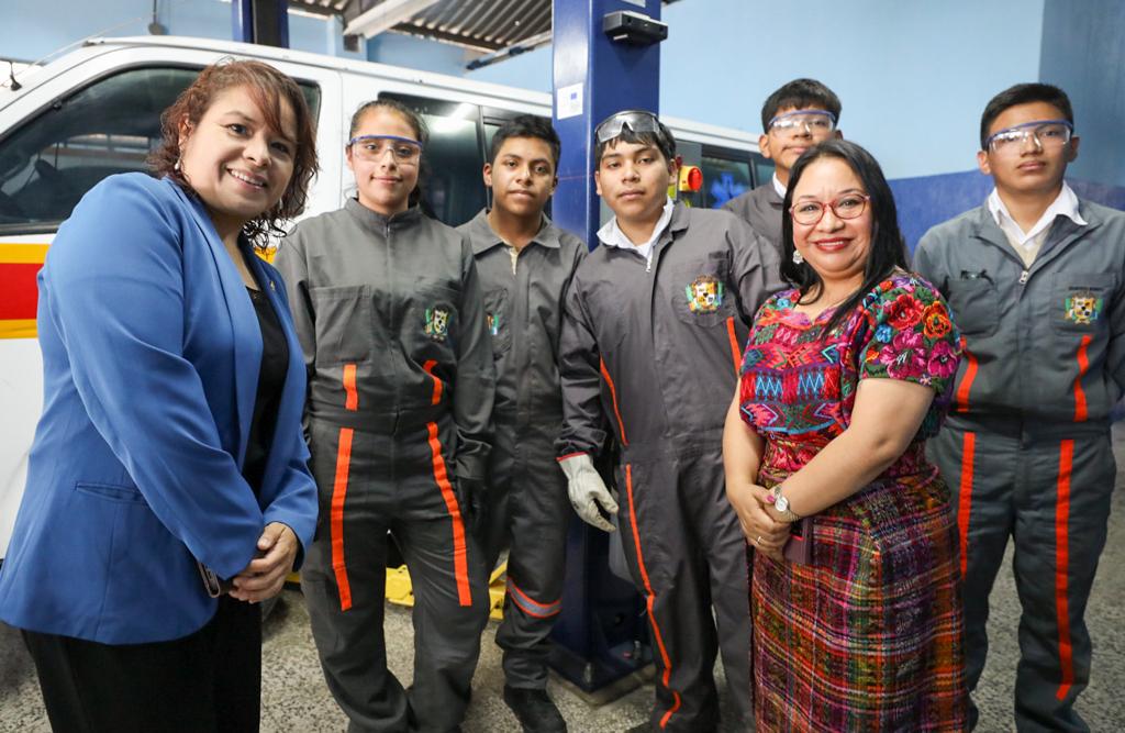 La ministra de Economía, Luz Pérez, en compañía de la viceministra de Educación Bilingüe e intercultural del Ministerio de Educación, Carmelina Espantzay Serech, entregaron este jueves la primera donación de equipo técnico que beneficiará a seis institutos nacionales de educación diversificada, especializados en áreas de diagnóstico y reparación de vehículos automotrices, carpintería y cocina.