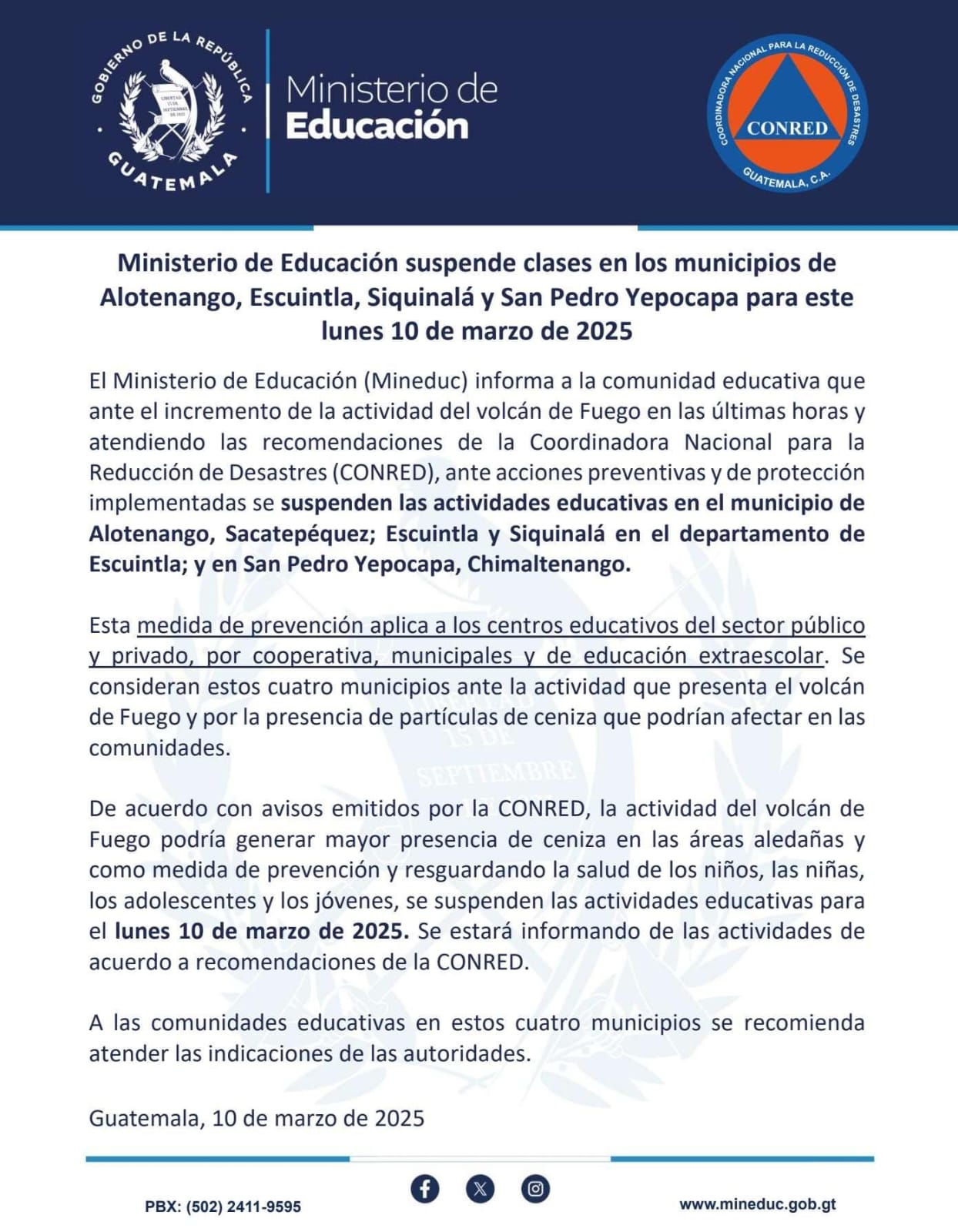 El Ministerio de Educación (Mineduc) informa a la comunidad educativa que ante el incremento de la actividad del volcán de Fuego en las últimas horas y atendiendo las recomendaciones de la Coordinadora Nacional para la Reducción de Desastres (CONRED), ante acciones preventivas y de protección implementadas se suspenden las actividades educativas en el municipio de Alotenango, Sacatepéquez; Escuintla y Siquinalá en el departamento de Escuintla; y en San Pedro Yepocapa, Chimaltenango.