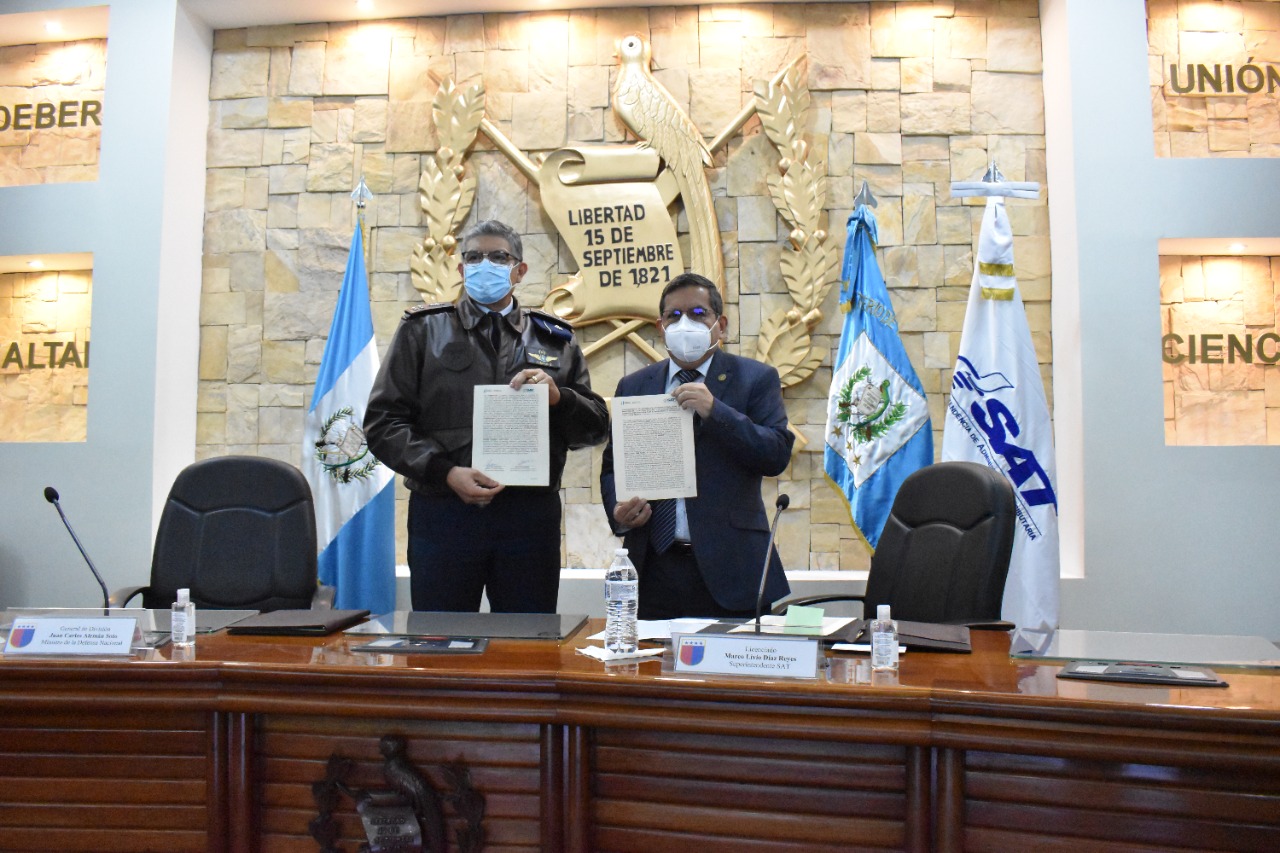 El Ministerio de la Defensa Nacional, suscribió este 16 de noviembre, un convenio de cooperación interinstitucional con la Superintendencia de Administración Tributaria (SAT), con el objeto de intercambiar de forma mutua información y asistencia técnica para mejorar las atribuciones de cada institución. Dicho convenio fue suscrito por el señor Ministro de la Defensa Nacional, General de División Juan Carlos Alemán Soto, así como por el Licenciado Juan José Arreaga, Intendente de Aduanas interino de la SAT.