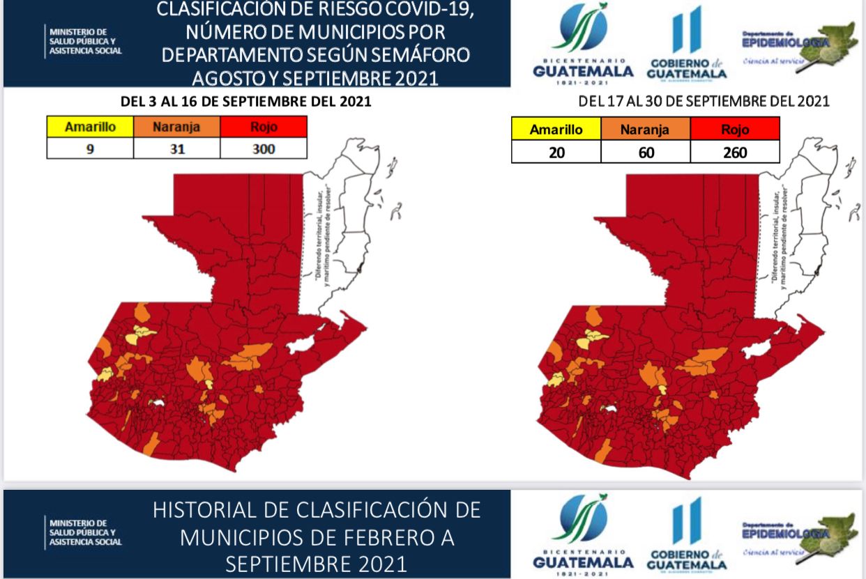 En un informe dado a conocer por el MSPAS sobre la clasificación de riesgo de la pandemia se estableció una leve recuperación luego de pasar de 305 a 260 municipios en rojo durante la segunda quincena de septiembre.