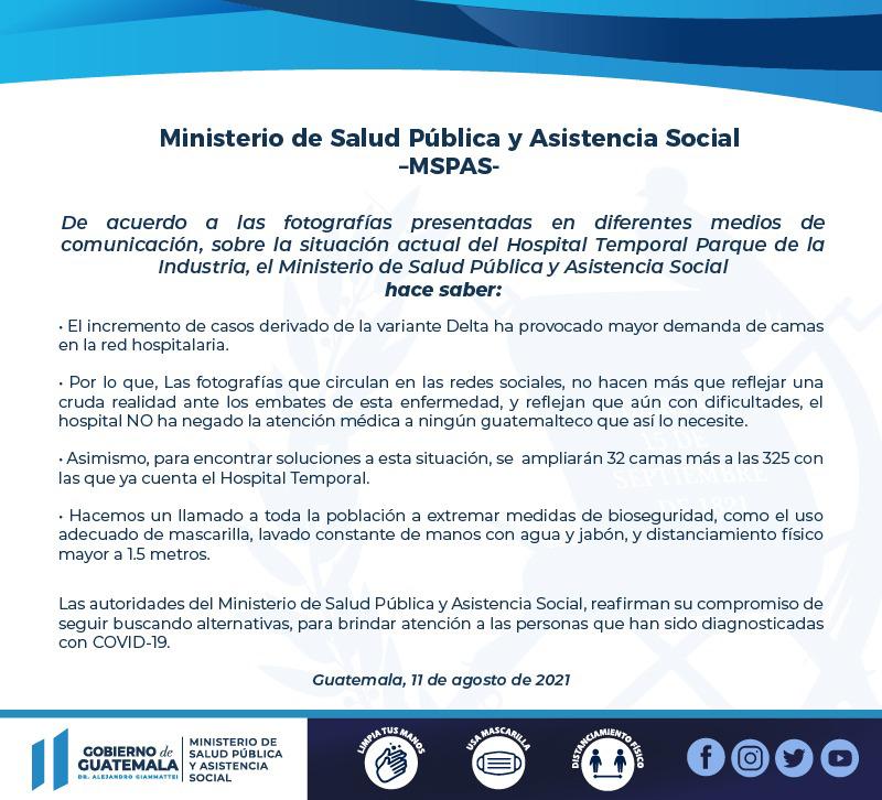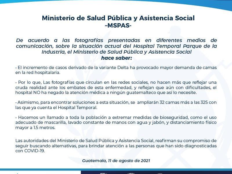 De acuerdo a las fotografías presentadas en diferentes medios de comunicación, sobre la situación actual del Hospital Temporal Parque de la Industria, el Ministerio de Salud Pública y Asistencia Social -MSPAS- hace saber: