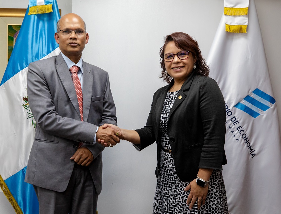 La ministra de Economía, Luz Pérez Contreras, recibió el jueves recién pasado la visita de cortesía del embajador de la India en Guatemala, Manoj Kumar Mohapatra, dentro del marco de cooperación que Guatemala tiene con el mencionado país asiático para mejorar las opciones de mercado de la MIPYMES guatemaltecas que poseen el distintivo Sello Blanco.