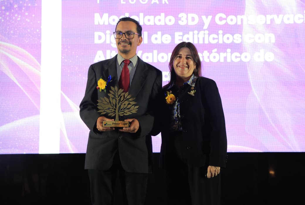 La ministra de Cultura y Deportes fue la encargada de entregar el premio a Pablo Ovalle Rodríguez, primer lugar de la categoría Legado Cultural con su proyecto “Modelado 3D y Conservación Digital de Edificios con Alto Valor Histórico de Guatemala”.
