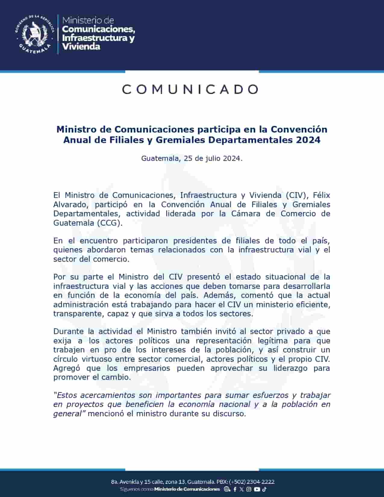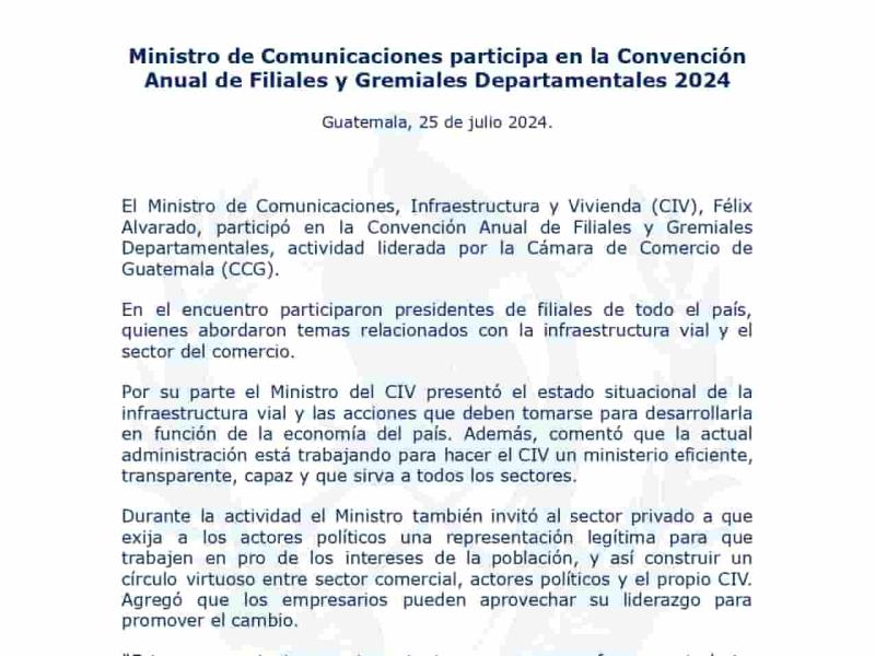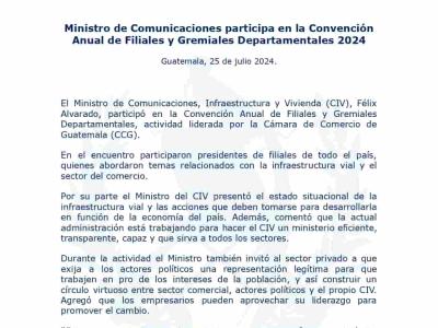 El Ministro de Comunicaciones, Infraestructura y Vivienda (CIV), Félix Alvarado, participó en la Convención Anual de Filiales y Gremiales Departamentales, actividad liderada por la Cámara de Comercio de Guatemala (CCG).