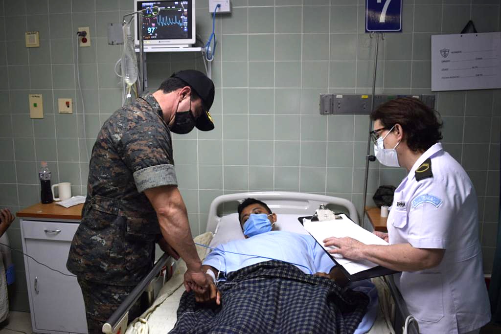 El General de División Henry Yovani Reyes Chigua, ministro de la Defensa Nacional, visitó a los soldados Marcos Choc Cacao, Sevin Alfredo Cucul Si y Natanael Tot Cuc, quienes son atendidos en el Centro Médico Militar, luego de resultar heridos en cumplimiento del deber en Livingston, Izabal. Durante su visita, el señor Ministro, verificó el estado de salud y atención médica que reciben; asimismo, agradeció al personal la importante labor que desarrollan en beneficio de los guatemaltecos, como integrantes de la Institución Armada.