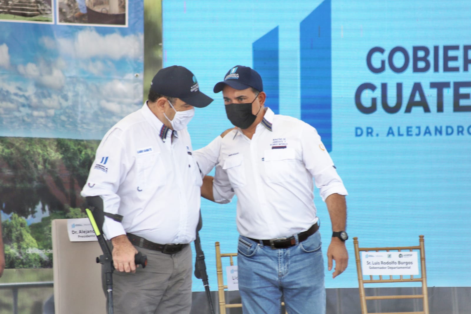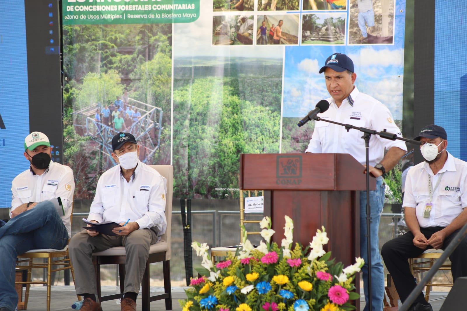 El ministro de Ambiente y Recursos Naturales, Mario Rojas Espino, en su calidad de presidente del Consejo Nacional de Áreas Protegidas (Conap), junto al presidente Alejandro Giammattei, participó este viernes en la entrega de contratos de prórroga de concesiones forestales comunitarias y la resolución de adjudicación de nuevas áreas, actividad que se desarrolló en Petén.