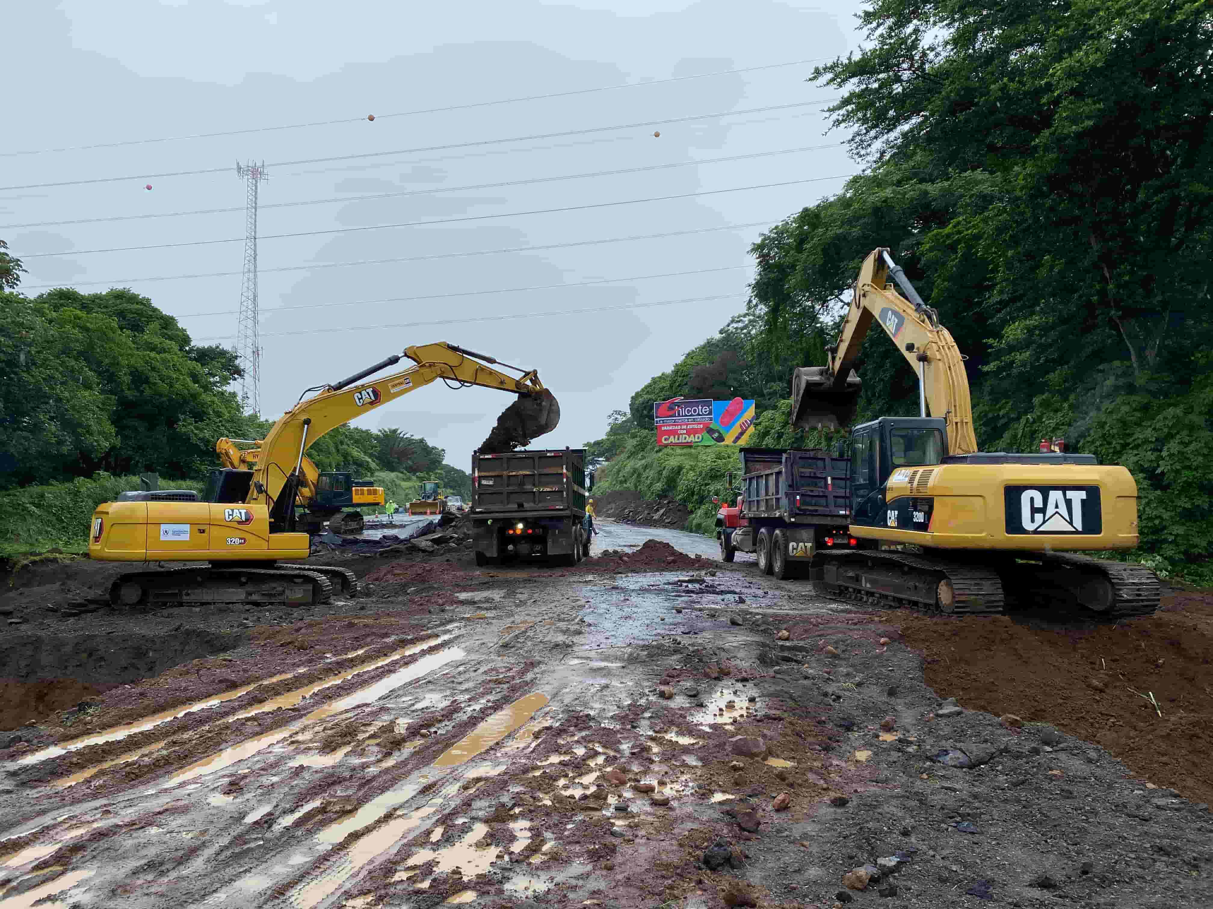 Actualmente, personal de la DGC, trabaja en el área con: 5 excavadoras, 4 camiones de volteo, cargador frontal y bomba de achique, la cual sirve para extraer el agua acumulada en el tramo. El personal de PROVIAL gestiona vías alternas para el transporte liviano y pesado, como la ruta antigua Palín-Escuintla y la Ruta Nacional 14, con el apoyo del departamento de tránsito de la PNC.
