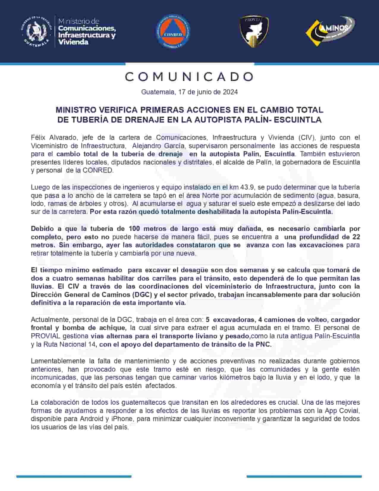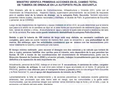 Félix Alvarado, jefe de la cartera de Comunicaciones, Infraestructura y Vivienda (CIV), junto con el Viceministro de Infraestructura, Alejandro García, supervisaron personalmente las acciones de respuesta para el cambio total de la tubería de drenaje en la autopista Palín, Escuintla. También estuvieron presentes líderes locales, diputados nacionales y distritales, el alcalde de Palín, la gobernadora de Escuintla y personal de la CONRED.
