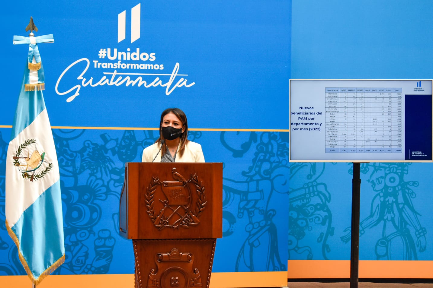 Guatemala, 22 de agosto de 2022. El Ministerio de Trabajo y Previsión Social (Mintrab) informó acerca de los avances que se han tenido del año 2020 a julio de 2022 en el Programa del Aporte Económico del Adulto Mayor (PAM). Para ello, la viceministra de Previsión Social y Empleo, Geovanna Salazar, habló acerca de los avances en el programa como el incremento -en 2022- del monto del aporte de Q400.00 a Q500.00, gracias al aumento en el presupuesto nacional.