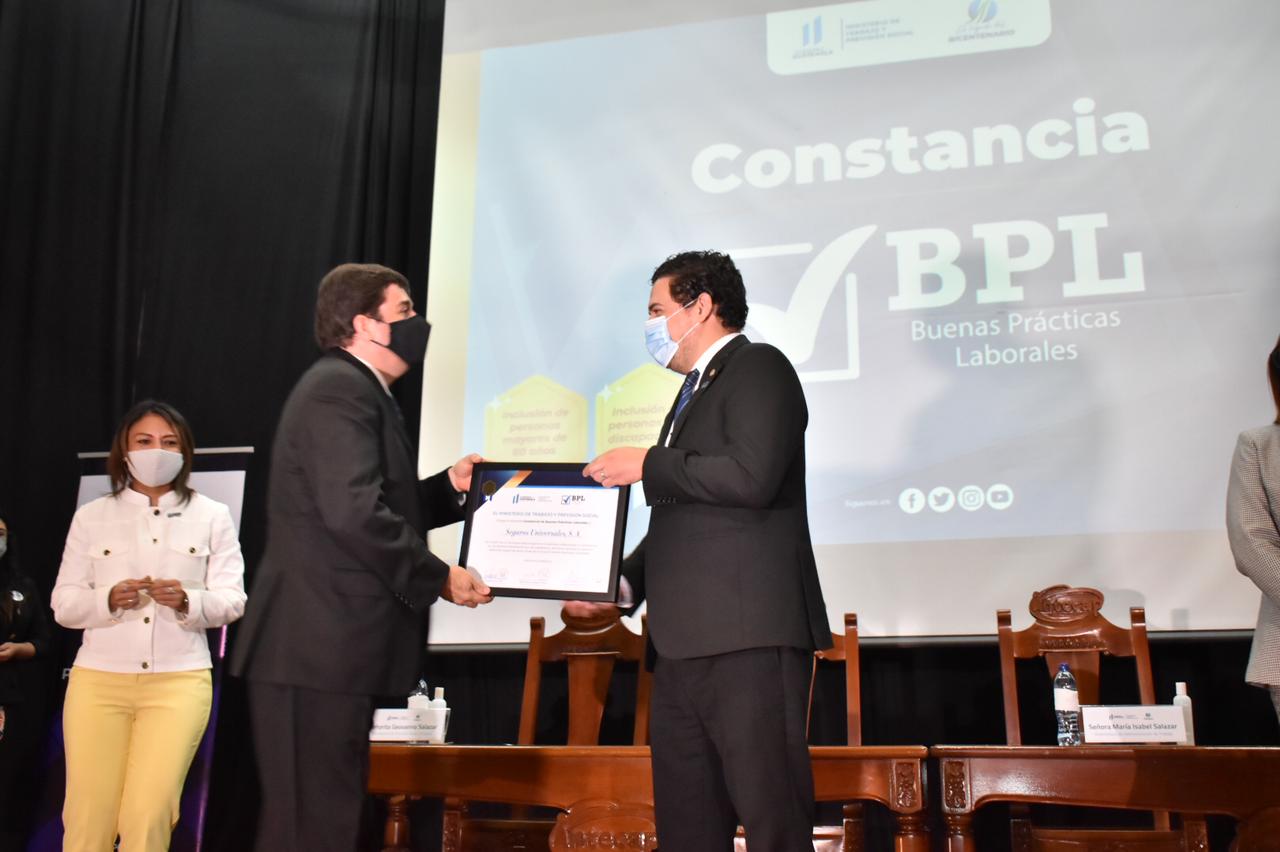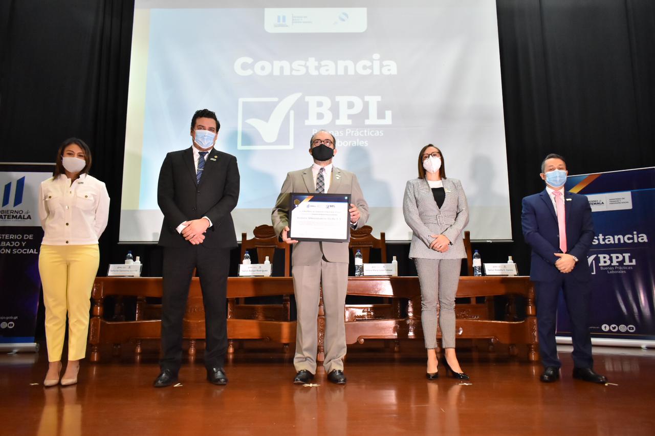 Guatemala, 28 de mayo de 2021. Doce empresas obtuvieron la Constancia de Buenas Prácticas Laborales –BPL- emitida por el Ministerio de Trabajo y Previsión Social, la cual fue entregada por el Despacho Superior de esta cartera en un acto protocolario en el auditorio del Instituto Técnico de Capacitación (INTECAP).