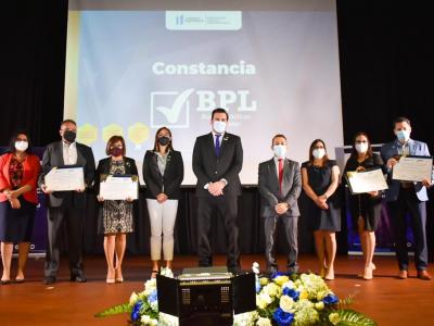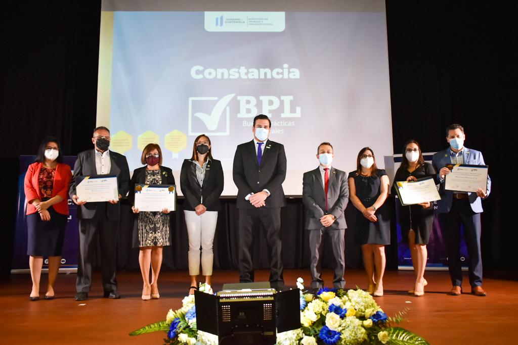 Guatemala, 15 de octubre de 2021. Veintiséis empresas obtuvieron la Constancia de Buenas Prácticas Laborales (BPL) emitida por el Ministerio de Trabajo y Previsión Social, la cual fue entregada por el Despacho Superior de esta cartera en un acto protocolario.