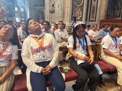 Durante la homilía de la Santa Misa, Monseñor Humberto González envió un saludo a todos los jóvenes y acompañantes de la delegación de Guatemala, dándoles la bienvenida al Jubileo de la Juventud que se llevará a cabo en Roma la próxima semana. Agradeció a los jóvenes por peregrinar, por visitar la Basílica de San Pedro para rezar por todas las peticiones que cada uno trae, y también por Guatemala.