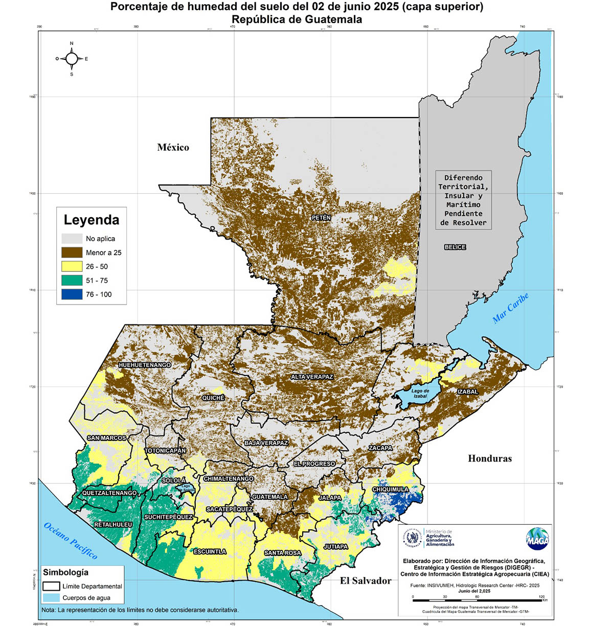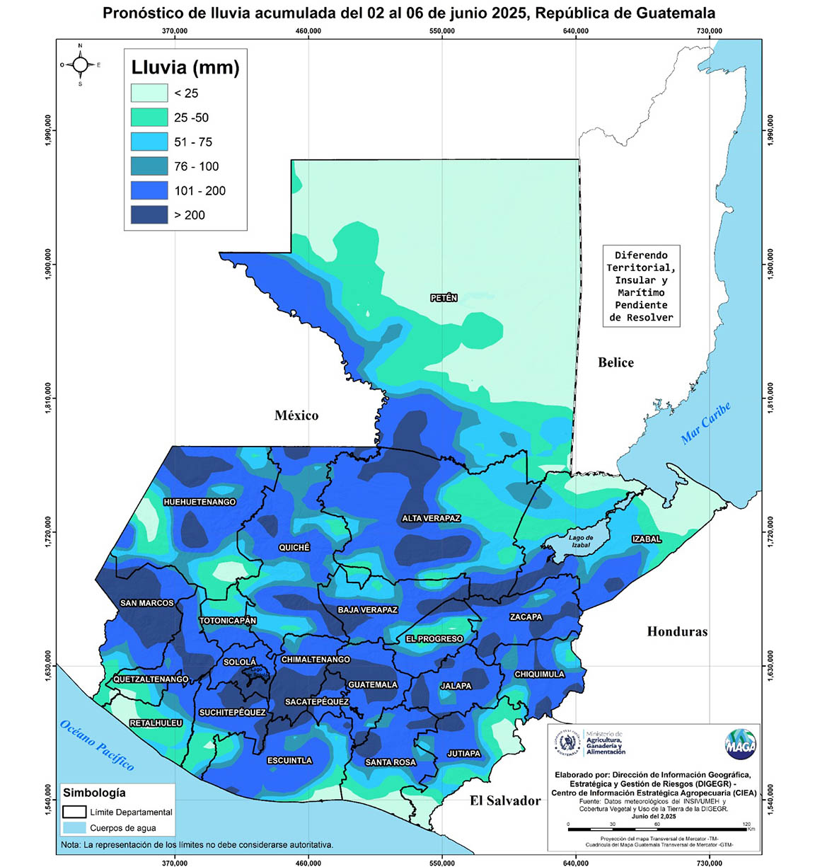 Durante la semana comprendida entre el 2 y el 6 de junio de 2025, se esperan lluvias en la mayor parte del país, por lo cual se realiza el monitoreo en 305 municipios de 22 departamentos, indica n el análisis agrometeorológico realizado por el Centro de Información Estratégica Agropecuaria de la Dirección Geográfica, Estratégica y Gestión de Riesgos (DIGEGR), del Ministerio de Agricultura, Ganadería y Alimentación (MAGA), con base en el pronóstico del Instituto Nacional de Sismología, Vulcanología, Meteorología e Hidrología (INSIVUMEH).