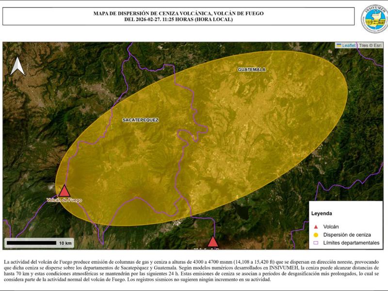 Se prevé la persistencia de la actividad volcánica, con posible caída de ceniza en los departamentos de Sacatepéquez, Guatemala y El Progreso, lo que podría afectar suelos, hojas y ganado, si no se aplican medidas preventivas.
