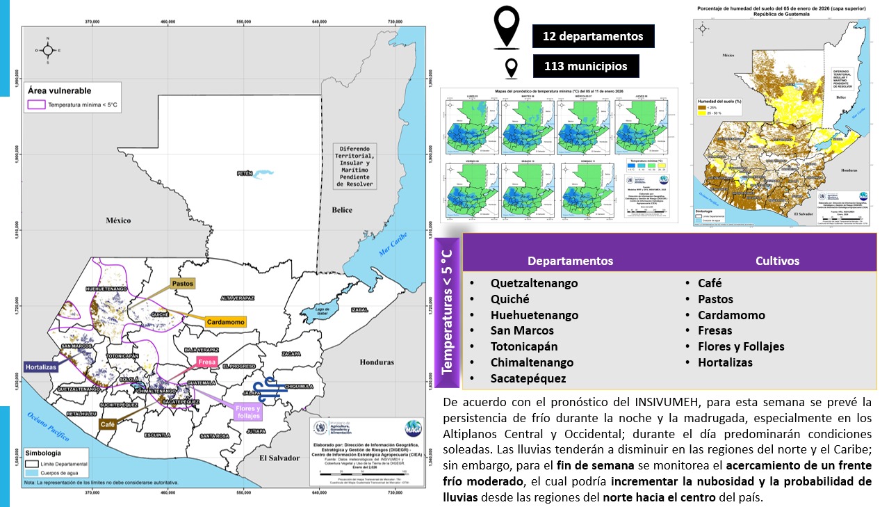 Se desarrolla un monitoreo constante del sector agropecuario ante la persistencia de bajas temperatura y posible ingreso de un frente frío, de acuerdo con el análisis agrometeorológico correspondiente a la semana del 5 al 9 de enero de 2026, elaborado por el Ministerio de Agricultura, Ganadería y Alimentación (MAGA) con base al pronóstico del Instituto Nacional de Sismología, Vulcanología, Meteorología e Hidrología (INSIVUMEH),