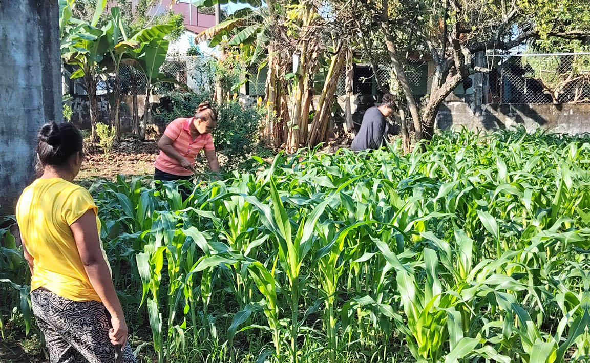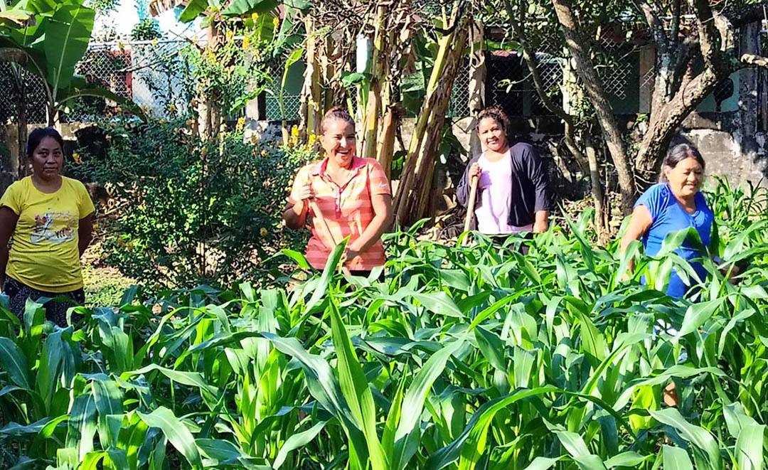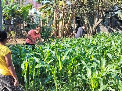 El huerto cuenta con diversos cultivos, entre ellos maíz (el más predominante), hierba mora, chipilín, frijol, pepino, chile pimiento, berenjena y zucchini, lo que contribuye a una producción variada y nutritiva para las familias participantes.