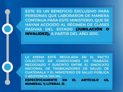 Este documento permite al MSPAS oficializar los procedimientos, parámetros y requisitos necesarios para que las personas que laboraron de manera continua en este Ministerio, retiradas por jubilación o invalidez obtengan este beneficio, no aplicando aquellas retiradas por destitución, remoción, fallecimiento, renuncia, separación del cargo.