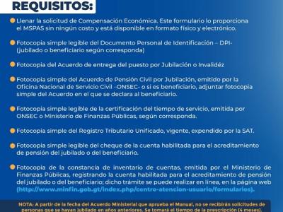 Dentro del documento también se establecen requisitos importantes a adjuntar en su expediente, tales como la fotocopia simple y legible del Documento Personal de Identificación – DPI-, ya sea jubilado o beneficiario, según corresponda, la fotocopia del Acuerdo de entrega del puesto por Jubilación o Invalidez; entre otros.