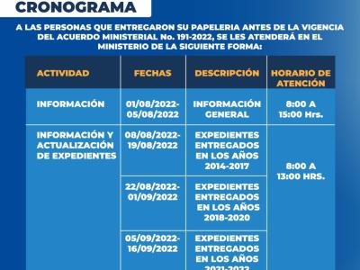 Para dar cumplimiento y agilización a esta importante gestión, el MSPAS ha diseñado un cronograma específico al que los jubilados que aplican a lo antes mencionado deben apagarse para completar su expediente, si entregaron su papelería antes de la vigencia del Acuerdo Ministerial 191-2022: